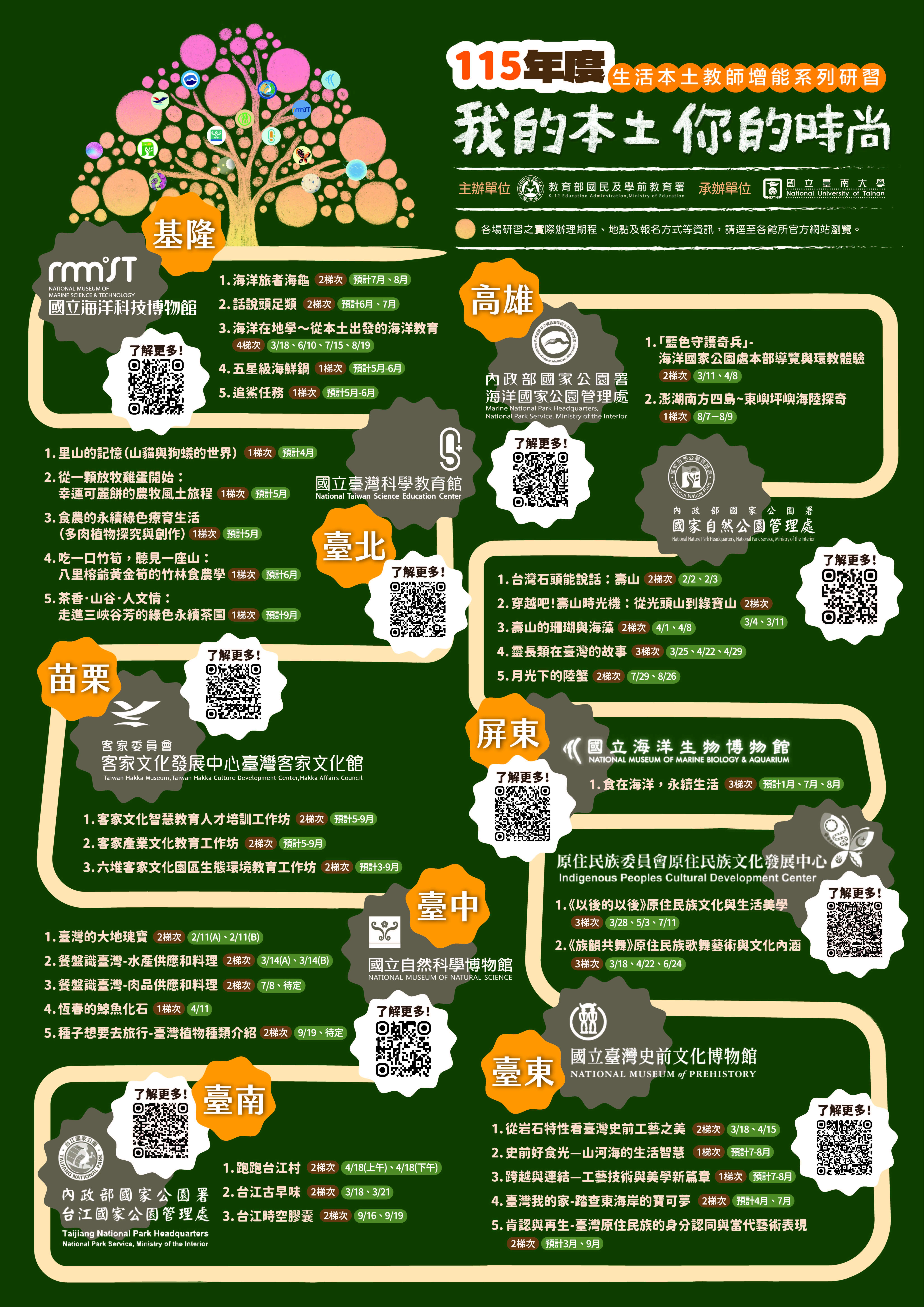 | 二、 | 為充實教師本土教育課程設計及教學知能,並促進教師運用場館既有之臺灣本土教育相關資源,國教署委請國立臺南大學結合各教育及文化場館資源,辦理旨揭系列研習活動,期引導教師習得生活與本土教育面向之關聯,俾使教師於課程教學時,結合本土教育相關資源,培養學生具備多元文化與國際理解之核心素養,賡續健全臺灣本土教育之多元面向。 |