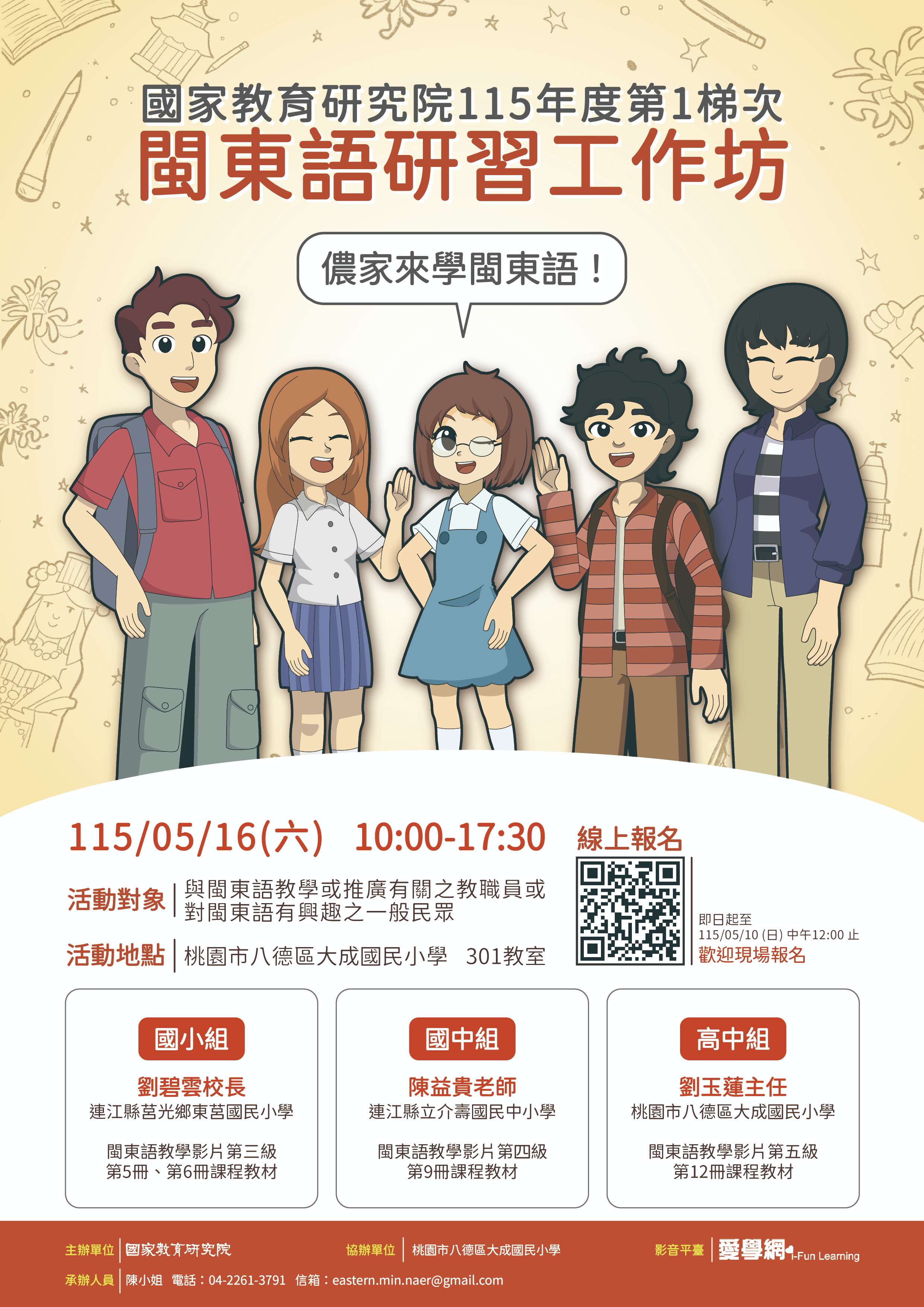 | 二、 | 為推動國家語言發展法,執行「國家語言整體發展方案」,國家教育研究院114年完成12支閩東語教學媒體影片製作;為推廣教學媒體影片,擴大使用效益,特別規劃辦理115年第1梯次「閩東語研習工作坊」活動,期透過教學經驗與實務分享,達到提升閩東語教學效益與運用範疇之目標。 |