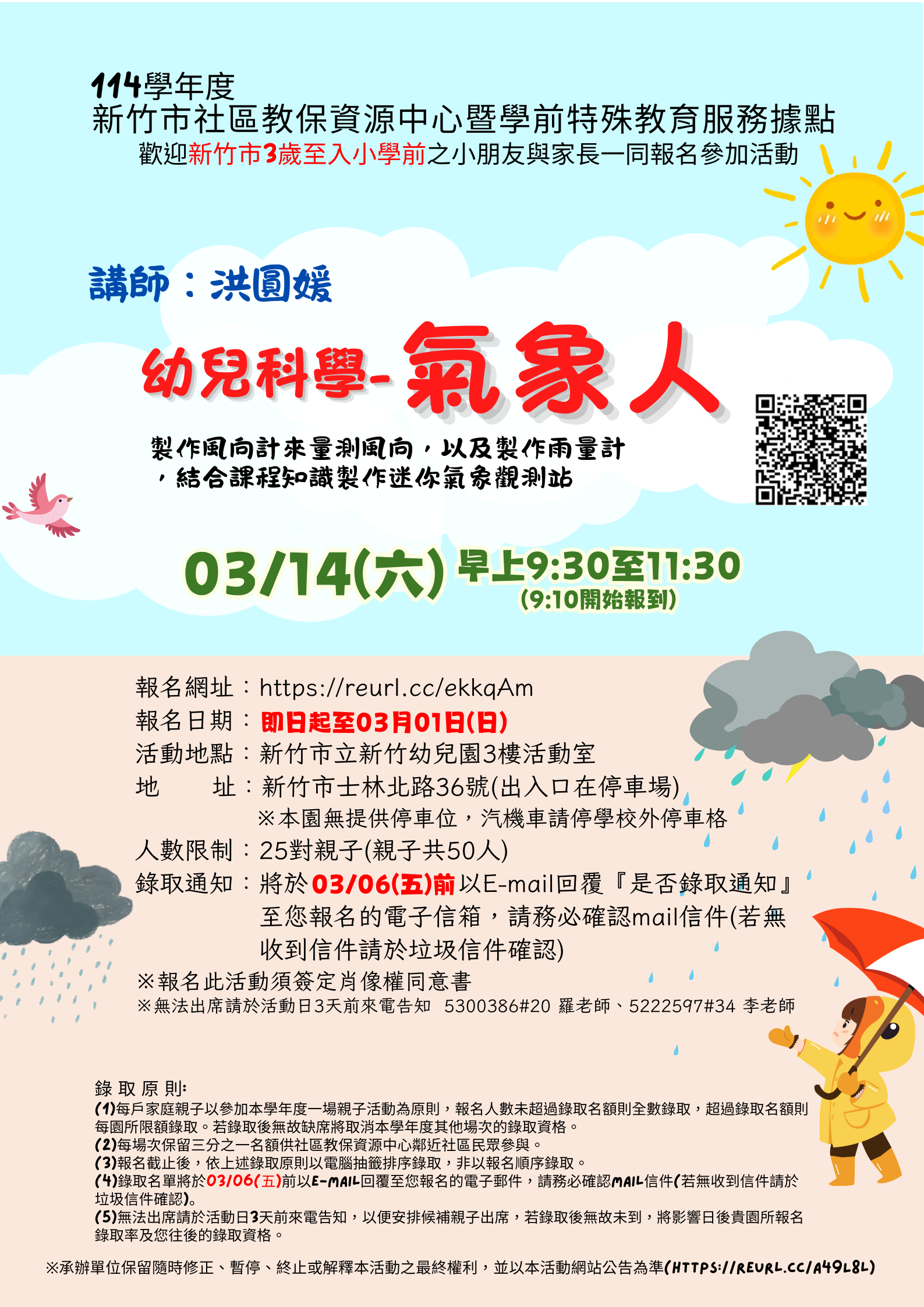 新竹市立幼兒園承辦本市教保資源中心暨特教服務據點,本次規劃「幼兒科學-氣象人」親子活動,活動內容以認識氣象工作者的日常,並介紹各種氣象資訊與日常生活的意義,製作風向計來量測風向,以及製作雨量計,結合課程知識製作迷你氣象觀測站。